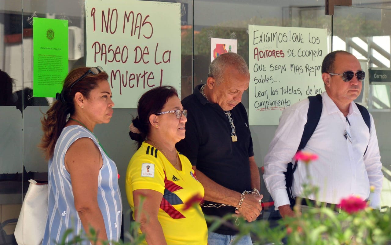Jesús Pavón protesta encadenado con su esposa porque la EPS Coomeva le suspendió hace un año y seis meses su tratamiento por un cáncer de piel que padece. Pese a que ganó una tutela, según la entidad sólo están obligados a atenderlo en Bogotá. Esta es una constante permanente de vulneración al derecho prioritario a la salud. Las autoridades tienen que hacer algo. ¡No hay derecho! Foto: Hernando Vergara