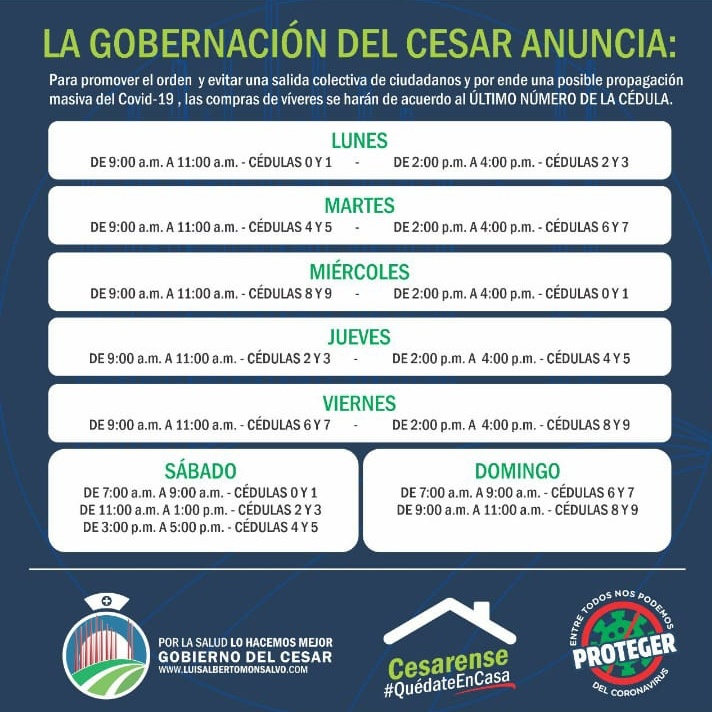 #PicoyPlacaparacompradevivieres. Desde este lunes se le solicita a los ciudadanos realizar compra de víveres de acuerdo con el último número de cédula para evitar concentración masiva y riesgo de propagación del coronavirus, tal como aparece en esta tabla.